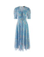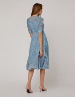 This dress is printed with a floral pattern of blue flowers. giving it a strong romantic femininity. The details of micro-puff sleeves and V-neck ruffled pleats add a touch of vitality and show elegance and charm.