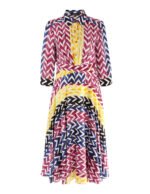 The nautical-inspired colourful woven stripe print is presented in bold colour schemes and hand-painted forms. with a distinctive texture that emerges. The silk crepe de chine material is skin-friendly and comfortable. the upper body drapes smoothly and elegantly. the waist cross structure modifies the waist line. and expresses a romantic and beautiful. full of the colours of spring and summer.