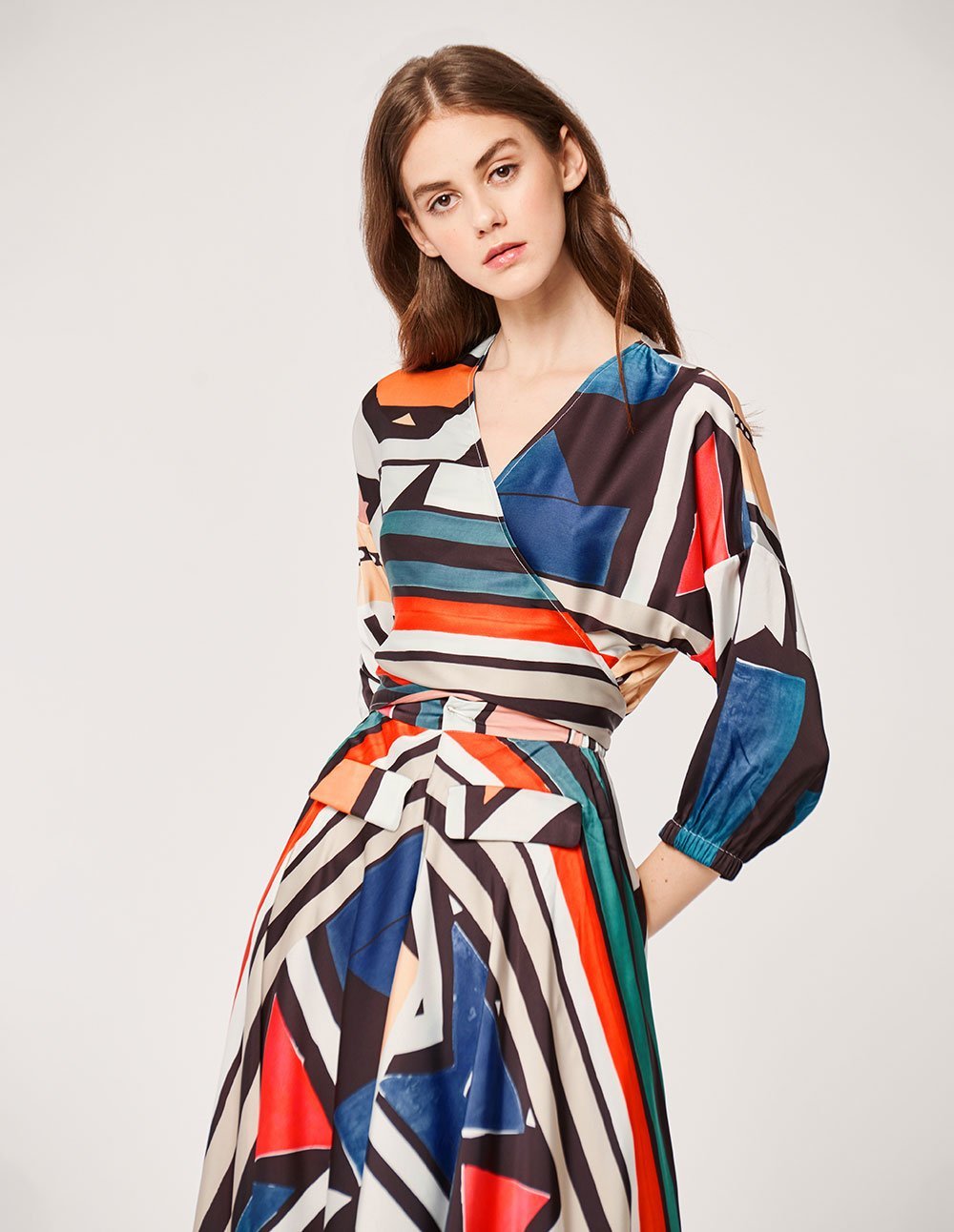 It is inspired by Ndebele national pattern. and the gorgeous colors present an exotic atmosphere.The silk fabric is draped and light. and waist-cut A-line skirt modifies the body shape. V-neck stand modifies the neckline. and off-shoulder lantern sleeves add a retro mood in spring and summer.