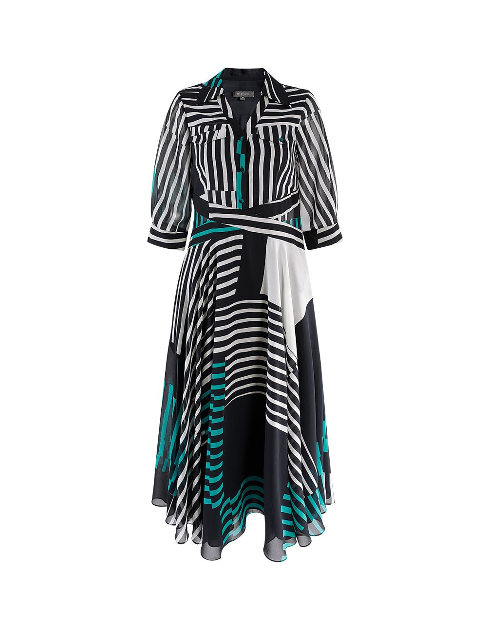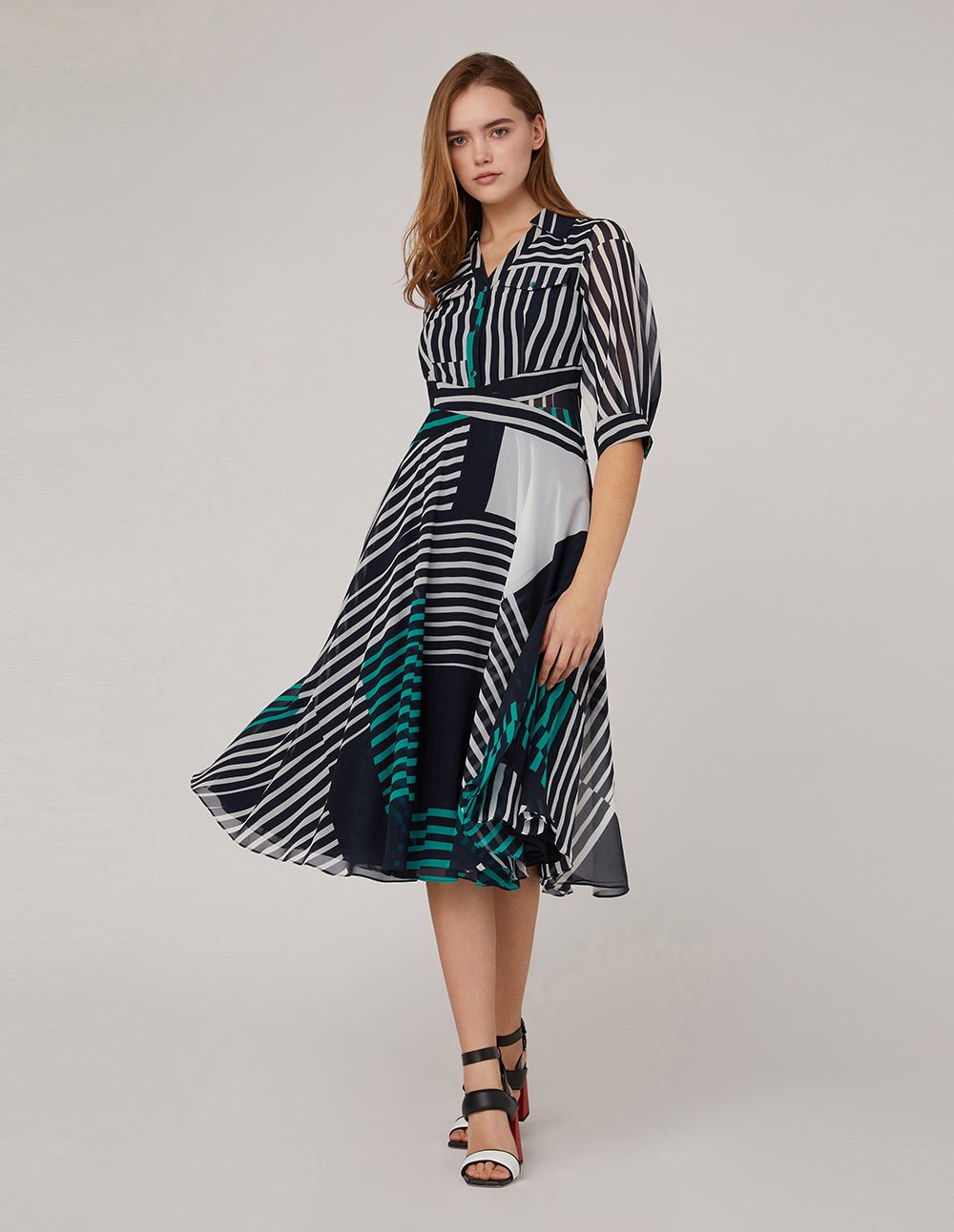 The nautical style stripe elements are used to show the classic and fashionable tonality through color contrast and graphic arrangement. The shirt collar with V-neck design is simple and generous. and the waist is divided into details with printing. and it is matched with the A-shaped profile. which can highlight the curvilinear beauty of the female body shape. The fit is suitable for many occasions.