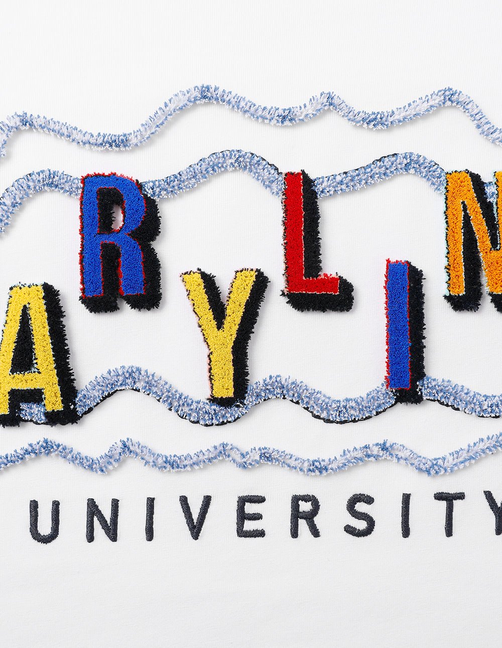 MARYLING is inspired by print patterns. It uses the thick and lively century school book font as the decorative pattern and uses three-dimensional toothbrush embroidery technology to interpret it. The classic T-shirt style. three-dimensional embroidery. and toothbrush embroidery show exquisite embroidery craftsmanship; the MARYLING colored fonts are like musical notes. dancing up and down in irregular arcs.